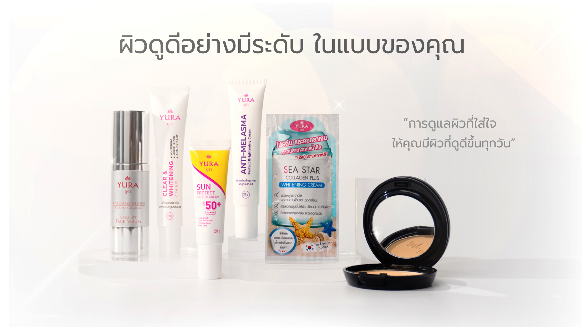 ผลิตภัณฑ์ YURA นี้จุดเด่นคือทำให้ผิวหน้าแลดูขาวอมชมพู ซึ่งมีส่วนผสมของ Moisturizer และ Anti-Aging ถ้าหากทางลูกค้าจะใช้ YURA เพียงตัวเดียวสามารถใช้ได้ แต่ถ้าให้ดีที่สุดควรใช้คู่กันทั้ง 2 ตัว ได้แก่ ยูร่า พิงค์คิชไวท์ 3 อิน1 และ ยูร่า บิวตี้ซันสกรีน 3 อิน 1 SPF 40 PA +++